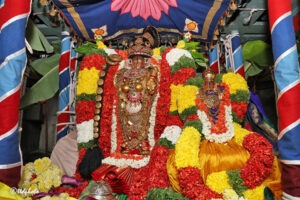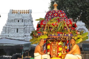 As part of the festivities, Sri Andal Ammavaru and Sri Krishna Swamy were seated on the Bhogi Theru (chariot) and taken in a colourful procession along the four mada streets surrounding the temple in the evening. Devotees offered camphor harathi and had darshan of the Lord and the Goddess with great devotion.