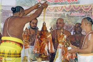 Earlier, Pallaki Utsavam was observed between 6.30 am and 7.30 am for the processional deities. From 9 am to 9.55 am, Snapana Tirumanjanam was performed to Sri Kalyana Venkateswara Swamy along with Sridevi and Bhudevi, and Sri Sudarshana Chakrattalwar, facing the temple Pushkarini.
