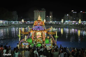 On the first day, from 6.30 pm to 8.00 pm, Sri Kodandarama Swamy graced the finely decked float in the waters of the temple pushkarini.