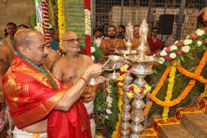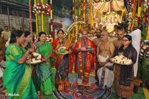 The priests first performed Punyahavachanam, Sadyah Ankurarpanam, Rakshabandhanam, and Visesha Aradhana. This was followed by Rakshabandhanam, Agni Pratishtha, Madhuparkam, Kanyadanam, Mahasankalpam, Mangalyapuja, Mangalyadharana, Ukta Homams, Poornahuti, Nivedana, Akshatarohanam, Mutyala Talambralu Samarpana, Visesha Nivedana, Malamarpidi, Harati, Chaturveda Parayanam, and Vedic blessings to the Yajamani. After the rituals, the divine couple’s procession was held in the temple premises.