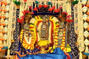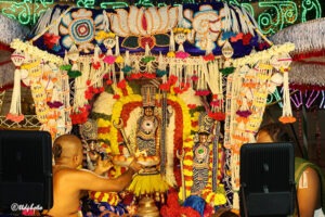 With elephants, bulls, and horses leading the procession, devotional singing groups performed bhajans and kolatam dances as the Lord moved through the four mada streeAts surrounding the temple.