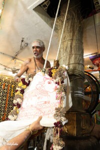 The utsava deities, blessed devotees on the unique carrier along the temple streets.