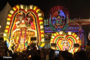 The utsava deities, blessed devotees on the unique carrier along the temple streets.