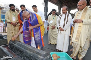 Earlier on his arrival at the Mahadwaram, he was received by the Honourable Minister of AP Endowments, Anam Ramanarayana Reddy, TTD Chairman, BR Naidu, EO Muddada Ravichandra, Additional EO Sri Ch Venkaiah Chowdary and CVSO Sri Muralikrishna.