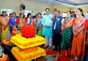 The girl students and women teachers arrived in their best attire and participated in the preparation of Bathukammas by stacking different varieties of flowers in a conical shape and worshipping Goddess Guari. The students and teachers danced around the beautiful floral formation of Bathukammas and Goddess Gauri by singing songs in her praise with religious fervour and unmatched enthusiasm. Later, the Bathukammas were immersed in the Kothapalli minor irrigation tank as part of the ritual.