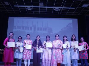 The ceremony also featured the prize distribution for the Mehendi Competition, showcasing the artistic talent and creativity of the students. Participants were applauded for their intricate designs and innovative patterns that reflected cultural elegance. The winners were honoured with prizes and certificates, celebrating their outstanding skills and dedication.