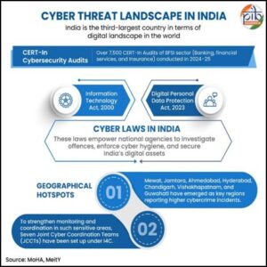 - Cybersecurity incidents in India rose from 10.29 lakh in 2022 to 22.68 lakh in 2024.