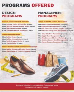 These programmes focus on design innovation, material science, advanced manufacturing, performance footwear, and high-fashion aesthetics, supported by state-of-the-art labs and strong industry collaboration.