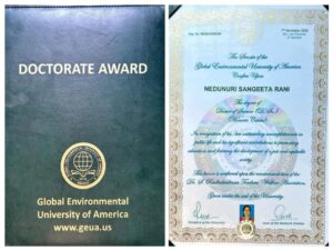 JAGTIAL, DECEMBER 03, 2025: The Global Environmental University of America has conferred honourary Doctorate on Nedunoori Sangeeta Rani, Assistant Professor of Zoology, at Government Women’s Degree College (Autonomous), Jagtial, in recognition of her contributions in the field of education.