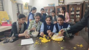 On this occasion, chemical colours were completely avoided, and natural colours were prepared using flowers and plant-based materials possessing medicinal value. Colours were prepared from Bixa flowers, turmeric powder, Moduga (flames of forest) flowers, Hibiscus flowers, Thangedu flowers, Oleander flowers, Marigold flowers, Rose petals, Aparajita (Butterfly pea) flowers, Beetroot, Carrot, and Chrysanthemum flowers. The students enthusiastically prepared the natural colours themselves and celebrated Holi with great joy and excitement.