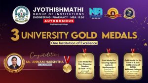 KARIMNAGAR, NOVEMBER 13, 2025: Annam Harshitha, a 2021 batch student of Jyothishmathi Institute of Technology and Sciences (JITS), Karimnagar, has bagged three gold medals in the upcoming convocation of the JNTU Hyderabad, scheduled for December 15, 2025.