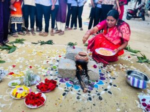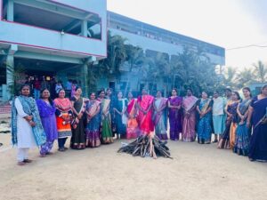 The event brought the essence of rural harvest traditions. On this occasion, Rangoli competitions, Mehendi, and hairstyle competitions were organised, in which the students participated with great enthusiasm. The entire college was filled with a festive atmosphere as students created colourful rangolis with attractive designs. Later, Bhogi bonfires were lit, and students traditionally celebrated Sankranti by placing ‘Gobbemmas’ in the Rangolis, singing folk songs, and enjoying various cultural activities.