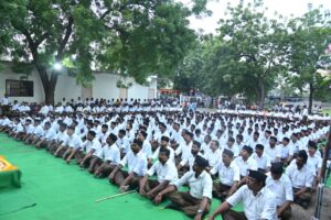 The march past began from Sri Satyanarayana Swamy temple in Ramnagar town. Speaking on the occasion, Mr Sanjay Kumar emphasised adopting the Sangh’s five principles of change—Swadeshi, social harmony, family enlightenment, environmental protection and civic duty.