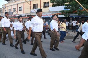 Wearing black caps, khaki trousers and full-sleeved white shirts with sleeves rolled up, and carrying wooden staves (dands) on their shoulders, volunteers marched through different localities. Residents showered them with flower petals as they passed. Participants from various age groups joined the programmes, reaffirming their commitment to the nation’s welfare.