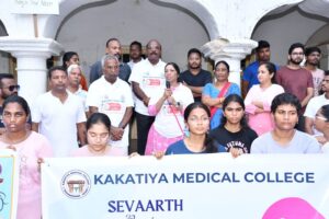 The walkathon, which began at Kakatiya Medical College and concluded at Public Garden, saw active participation from: Dr. Sriram Reddy, Dr. Ashok Reddy, Dr. Anil, Dr. Karunakar, Dr. Balaram Naik, Dr.Koorapati Ramesh, Physical Director Prabhakar Reddy, Sevaarth Club president Abdul Raoof, Vice president G.Ananya, General Secretary Nagireddy Sai Sudhamsh Reddy members of the club. Ramakrishna Rao, I. Hemangini and over 300 students from Kakatiya Medical College, Government Nursing College, Jaya College of Nursing, and Rohini College of Nursing actively took part in the mega event.